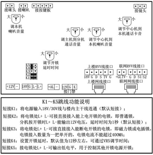 注:主機默認是接電控鎖,如果是接磁力鎖,須把K2插帽拔掉,然后短接K3 和K4插帽,這樣是通過調(diào)節(jié)VR5來設(shè)置開鎖時間,也可以只短接K3,然后通過在主機上輸入#00002002+XX來設(shè)置開鎖時間。