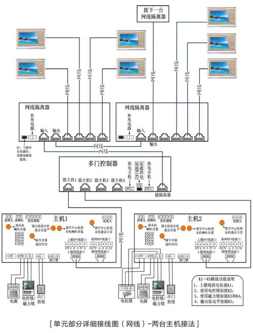 當一個單元中有多能主機在使用時,必須得設(shè)置主、副機號,以決定用戶按下監(jiān)視鍵時監(jiān)控哪個門口的圖像。因為監(jiān)視時只能監(jiān)視主機而不能監(jiān)視副機。但并不影響來訪者呼叫時看到的圖像。哪臺主機呼叫顯示哪個圖像。