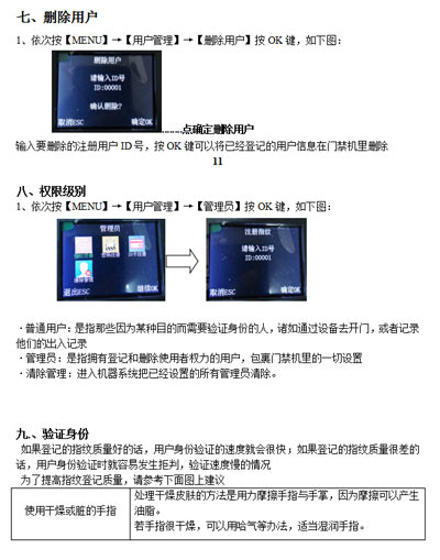 最終指紋還是無法識別的用戶,可將該指紋刷次再重新注冊,或注冊另一枚手指,這樣的用戶在注冊時需要選擇使用質(zhì)量較好的指紋(指紋清晰等),盡量使用手指接觸指紋采集頭面積大一些,注冊完成后做一下對比測試,并建議多注冊幾枚備用指紋。